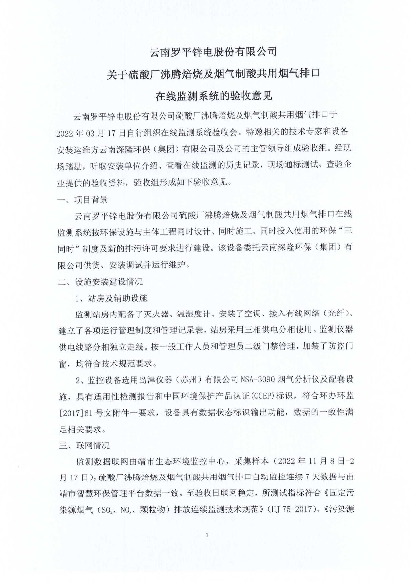 云南羅平鋅電li硫酸分廠沸騰爐廢氣排放口自動監(jiān)控系統(tǒng)驗收報告定稿.pdf